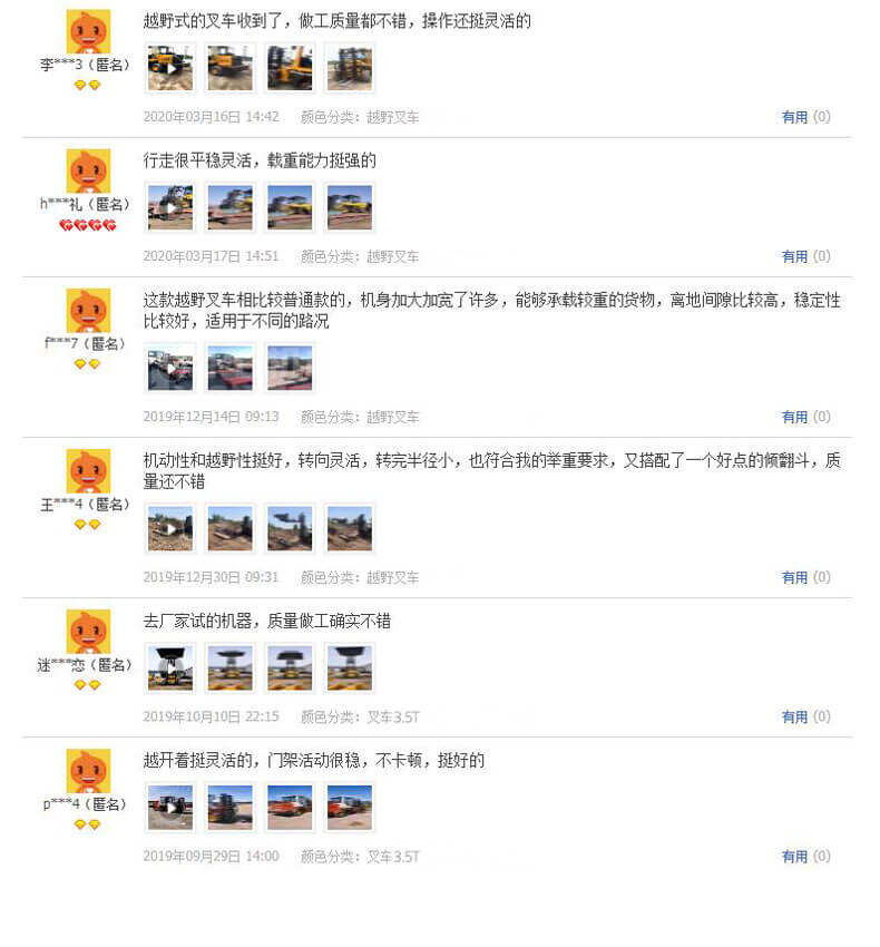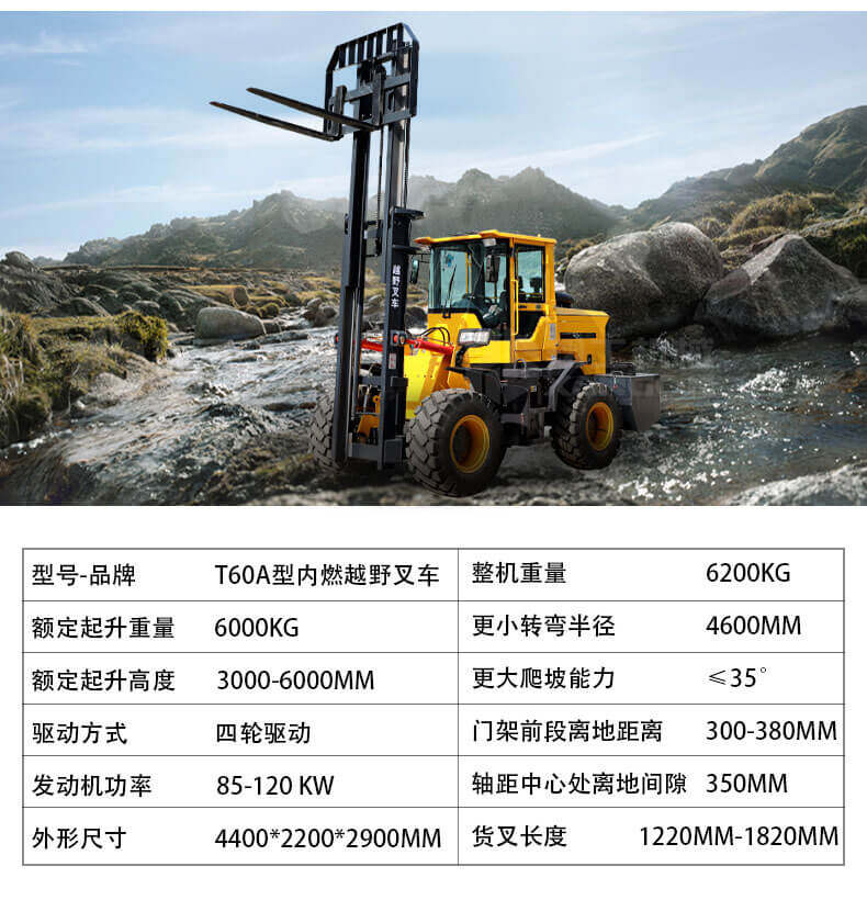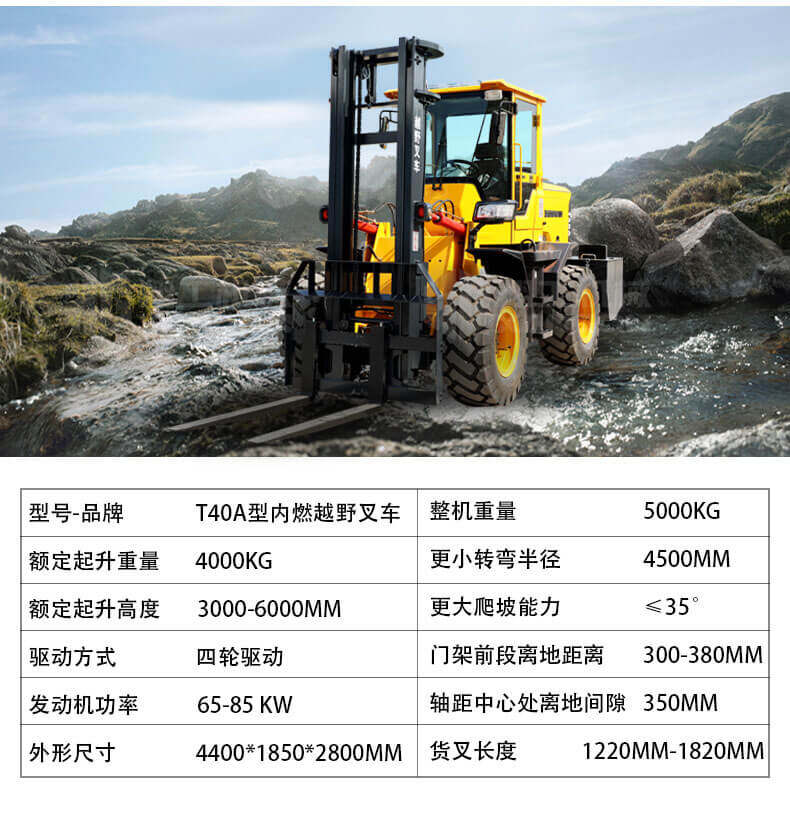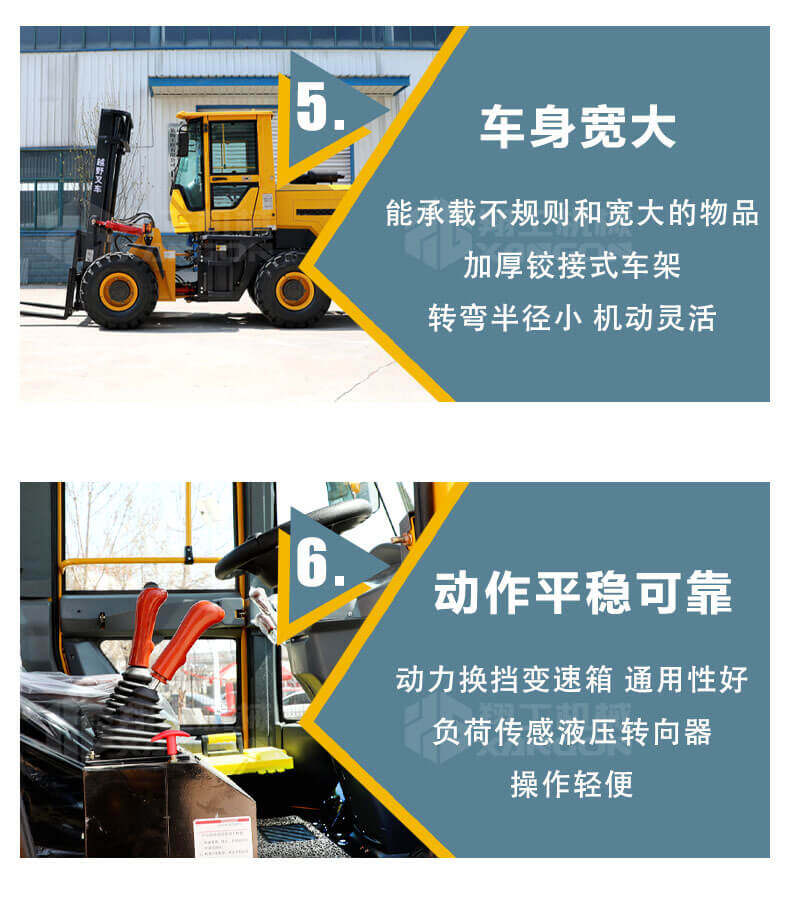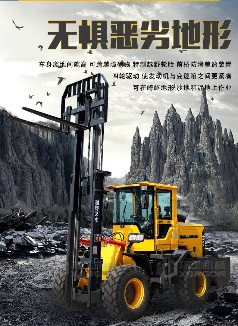 3.普通叉車只能在平整的路面上作業,而越野叉車既可以在普通路面上作業,還可以在山路泥路崎嶇道路作業,輪胎抓地力強,不打滑。